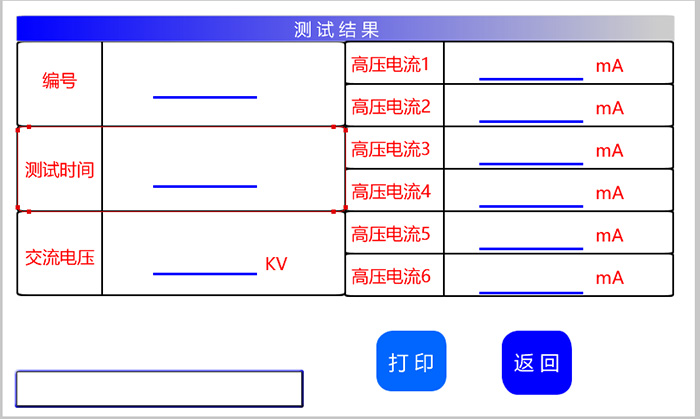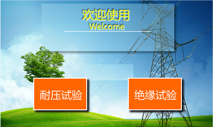 1、按照主界面(如圖3)選擇耐壓試驗(yàn)。按接線原理圖連接好引線,并將變壓器和控制箱可靠接地,控制箱的接地端必須接到變壓器的接地端,請(qǐng)勿直接接地線,防止控制箱接地而變壓器沒(méi)有良好接地。 2、試驗(yàn)前,檢查各部位的接線是否接觸良好,并檢查控制箱的輸入電壓是否為220VAC; 3、打開(kāi)電源開(kāi)關(guān),接通電源,顯示屏顯示出主菜單如圖2, (1)編號(hào):作為測(cè)試打印、保存查詢(xún)的標(biāo)識(shí); (2)測(cè)試時(shí)間:根據(jù)實(shí)際測(cè)試進(jìn)行設(shè)置 (3)升壓變比:根據(jù)外接變壓器可更改,變比值為儀表電壓:輸出電壓, 如儀表電壓100V,輸出電壓100KV,變比就設(shè)為1:1000; (4)保護(hù)電流:控制箱輸出的電流保護(hù)上限值; (5)設(shè)置電壓:即為實(shí)驗(yàn)電壓,最高100KV。 (6)自動(dòng)測(cè)試:開(kāi)始實(shí)驗(yàn)按鍵。 (8)廠家設(shè)置:有密碼保護(hù),廠家人員調(diào)試電壓電流用。 4、設(shè)置好參數(shù)后,觸摸啟動(dòng)按鍵,再次確認(rèn)后即開(kāi)始測(cè)試,測(cè)試過(guò)程中按下急停按鍵會(huì)停止測(cè)試,聽(tīng)到交流接觸器跳開(kāi)切斷電源。 5、試驗(yàn)完畢后,電壓會(huì)自動(dòng)降至零位,然后斷開(kāi)交流接觸器,此時(shí)可選擇打印測(cè)試結(jié)果或返回主菜單,如需解開(kāi)試驗(yàn)引線請(qǐng)關(guān)閉電源。